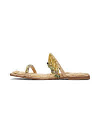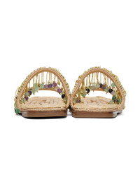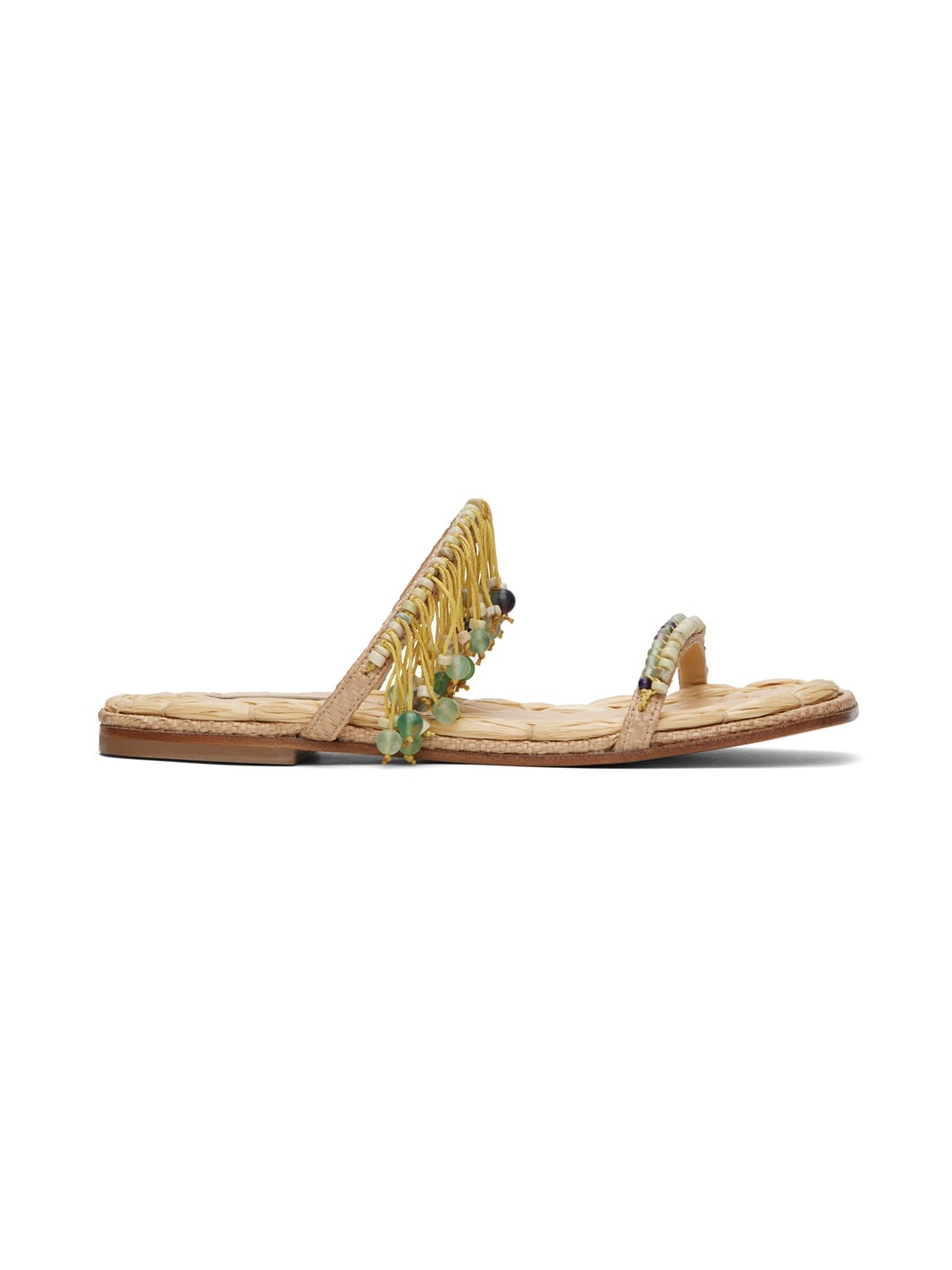 Woven raffia flat sandals in beige. · Open square toe · Beaded and fringe detailing at straps · Woven raffia and leather footbed · Leather sole with rubber injection Supplier color: Natural Upper: textile, leather. Sole: leather. Made in Italy 241358F124012