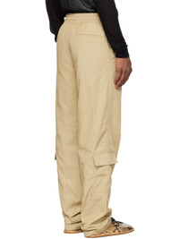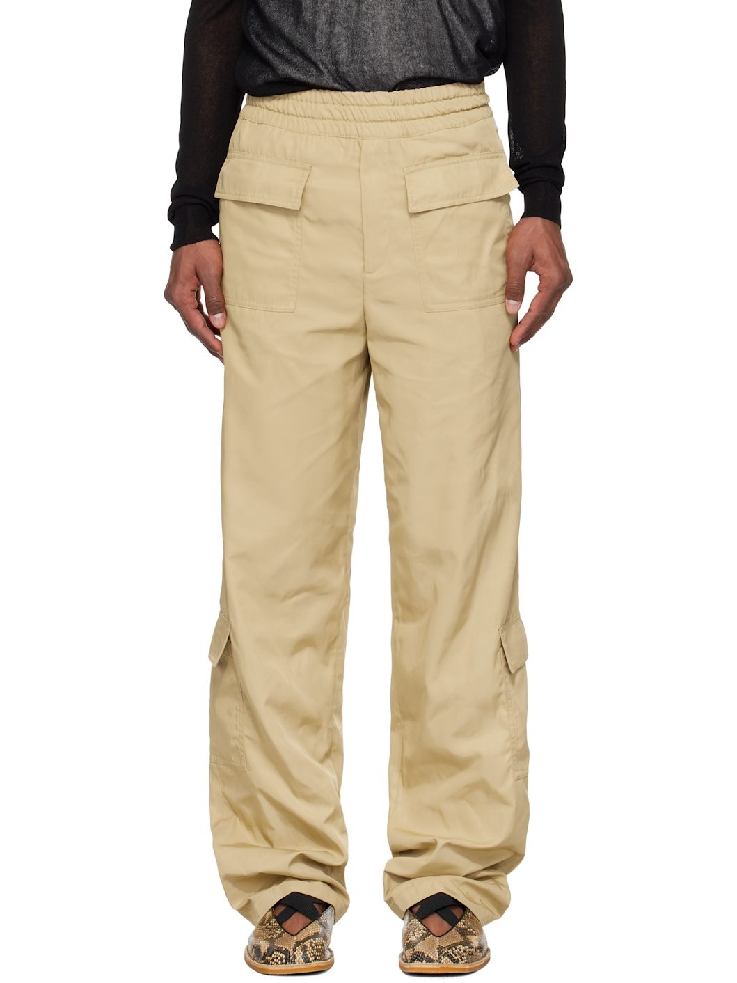 Polyester twill cargo pants. · Concealed drawstring at elasticized waistband · Five-pocket styling · Zip fly · Flap pocket at outseams · Darts at back waistband Supplier color: Cream 100% polyester. Made in Romania 251358M188020