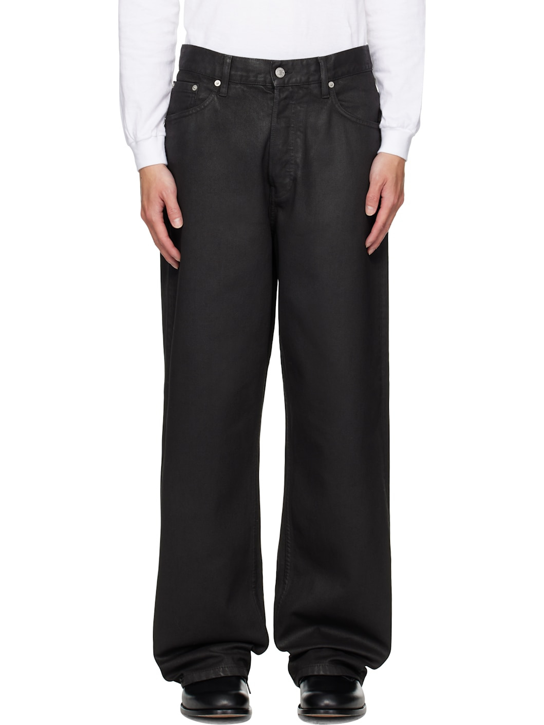 Coated heavyweight non-stretch denim jeans. · Loose-fit, straight-leg · Mid-rise · Belt loops · Five-pocket styling · Button fly · Pinched leather logo patch at back waistband · Logo-engraved silver-tone hardware Supplier color: Black 100% cotton. Made in Tunisia 252358M186015