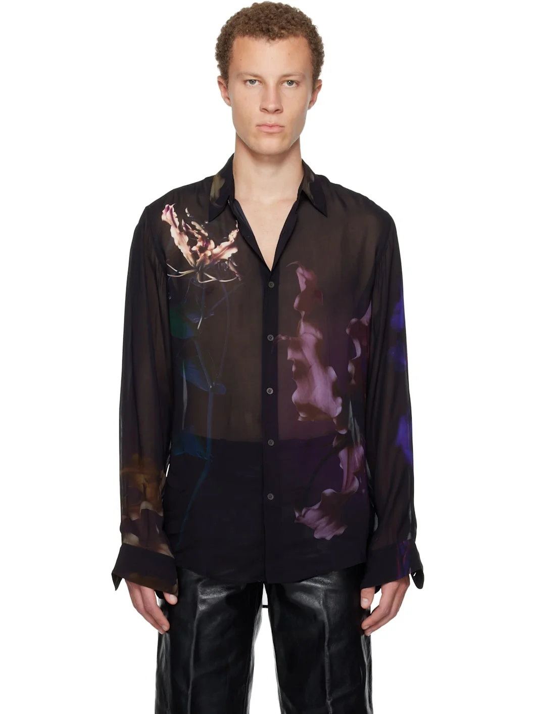 Semi-sheer viscose georgette shirt. · Floral graphics printed throughout · Spread collar · Button closure · Shirttail hem · Adjustable buttoned barrel cuffs Supplier color: Black 100% viscose. Made in Hungary 252358M192063