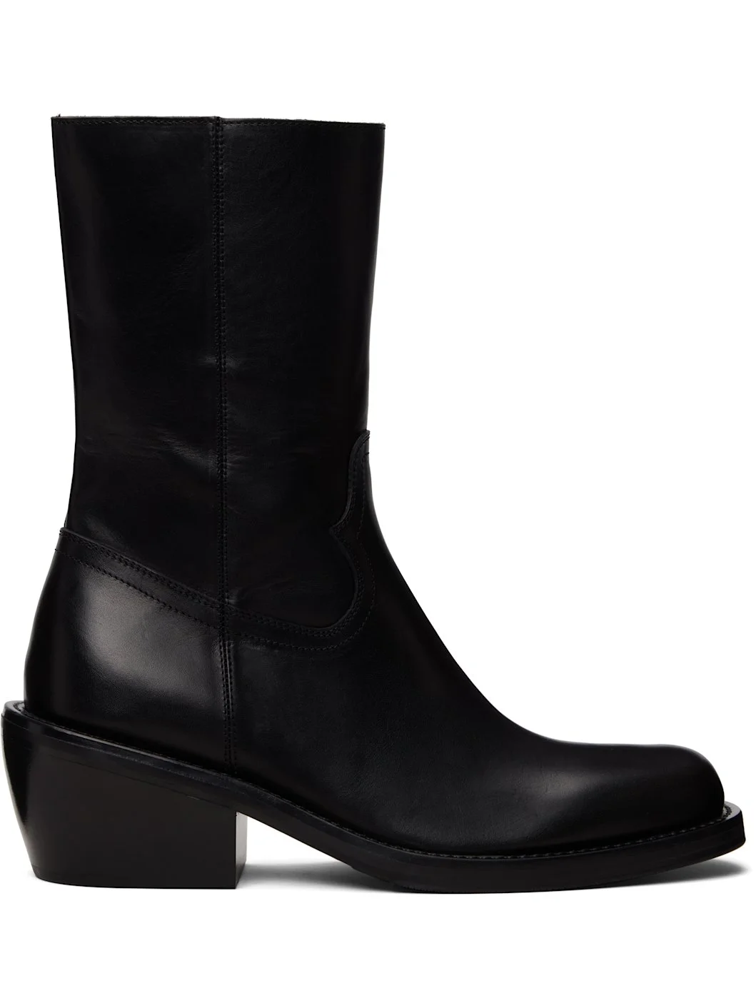 Mid-calf buffed calfskin boots. · Square toe · Western-style vamp · Zip closure at inner side · Calfskin lining · Stacked calfskin midsole and block heel · Treaded Vibram® rubber sole · Heel: H2.5" Supplier color: Black Upper: calfskin. Sole: calfskin, rubber. Made in Italy 261358M228003