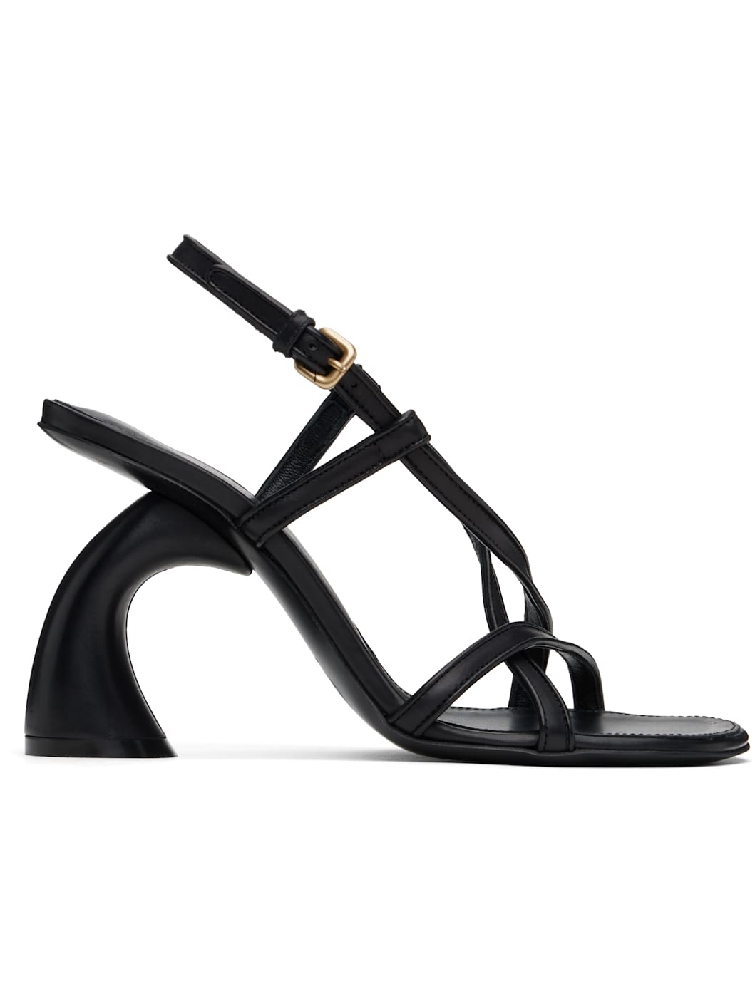 Buffed leather heeled sandals in black. · Open square toe · Crisscrossing straps at vamp · Pin-buckle slingback strap · Logo stamp at padded leather footbed · Covered sculptural heel with rubber injection · Leather sole · Heel: H3.5" Supplier color: Black Leather. Made in Italy 251358F125001