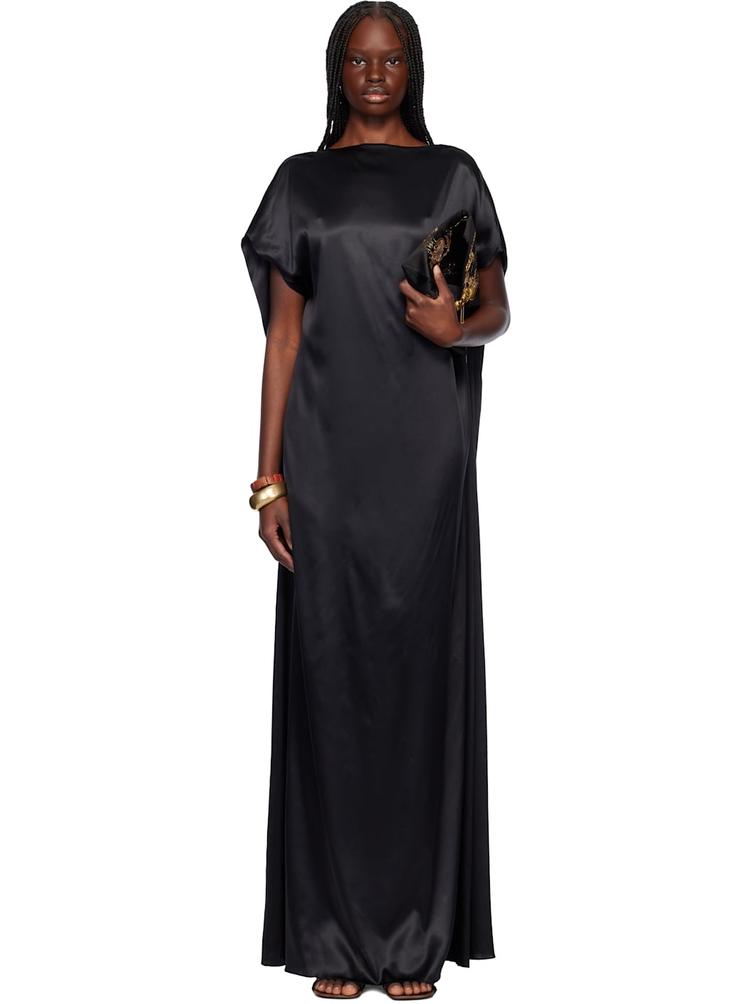 Loose-fit stretch silk satin maxi dress. · Boatneck · Cap sleeves · Cape-style low back · Partial silk satin lining Supplier color: Black Body: 94% silk, 6% elastane. Lining: 100% silk. Made in Poland 251358F055000
