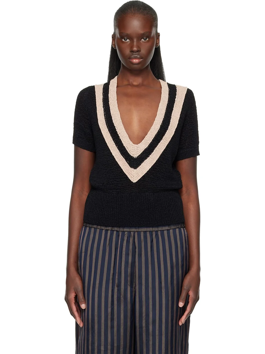 Semi-sheer open-knit sweater. · Stripes at plunging V-neck · Rib-knit hem and cuffs Supplier color: Black 60% viscose, 40% polyamide. Made in Belgium 261358F100000