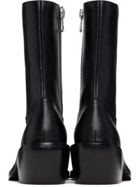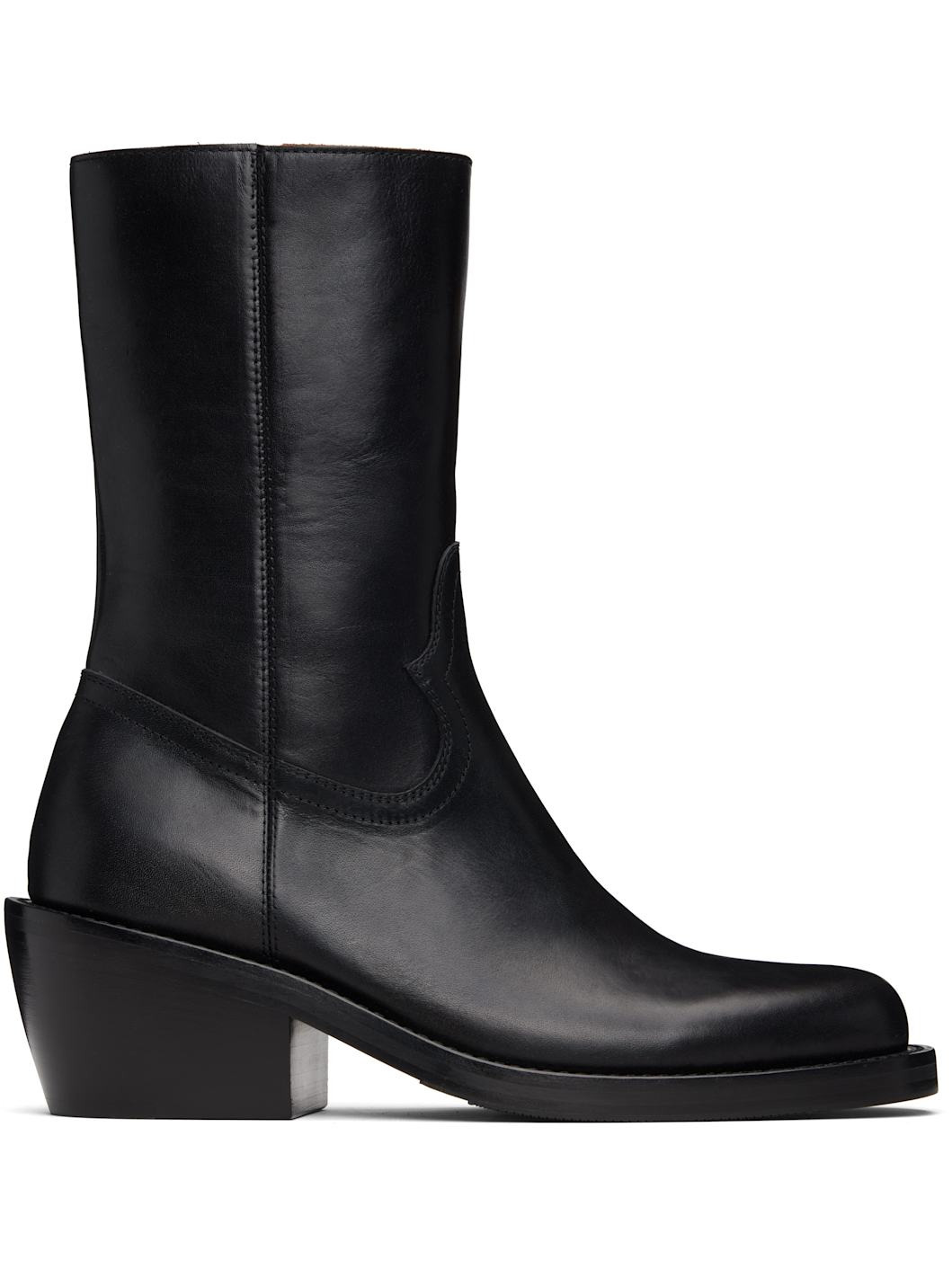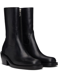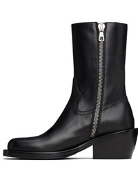 Mid-calf buffed leather boots. · Square toe · Zip closure at inner side · Topstitching at welt · Stacked leather heel with rubber injection · Leather sole with Vibram® rubber injection · Heel: H2.5" Supplier color: Black Upper: leather. Sole: leather, rubber. Made in Italy 252358M228006