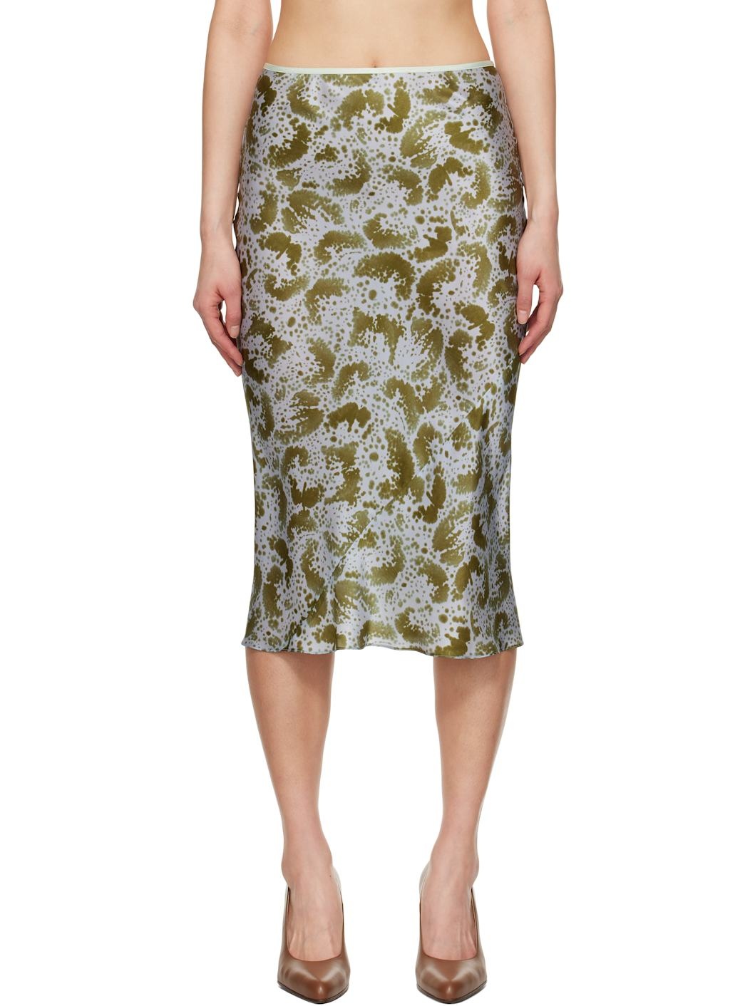 Silk satin midi skirt. Graphic pattern printed throughout. · Elasticized waistband · Central vent at back hem · Unlined Supplier color: Khaki 100% silk. Made in Poland 251358F092027