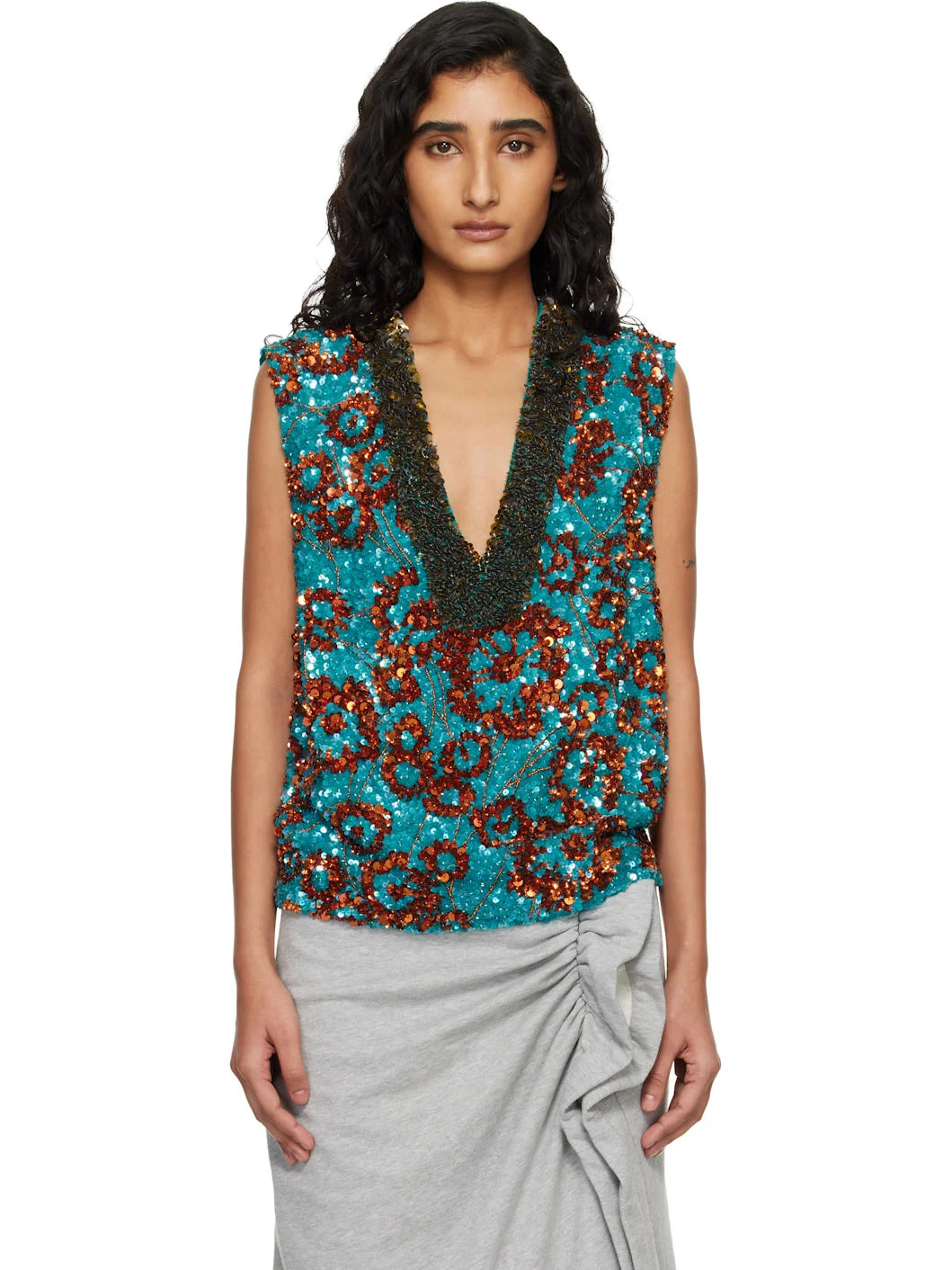 Viscose georgette top. · Sequinned floral pattern throughout · Plunging V-neck · Fully lined Supplier color: Turquoise Body: 100% viscose. Lining: 100% viscose. Made in India 261358F111005