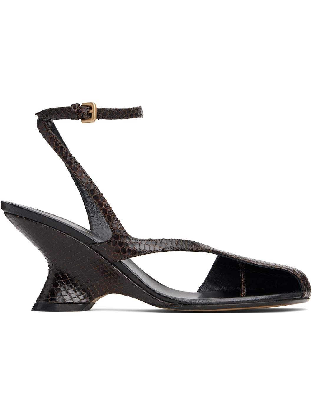 Snake-embossed leather heeled sandals. · Cutout at square toe · Pin-buckle ankle strap · Logo stamp at padded footbed · Covered wedge heel with rubber injection · Leather sole · Heel: H2.75" Supplier color: Dark brown Upper: leather. Sole: leather, rubber. Made in Italy 252358F125000