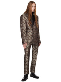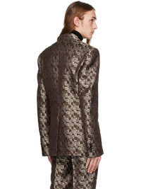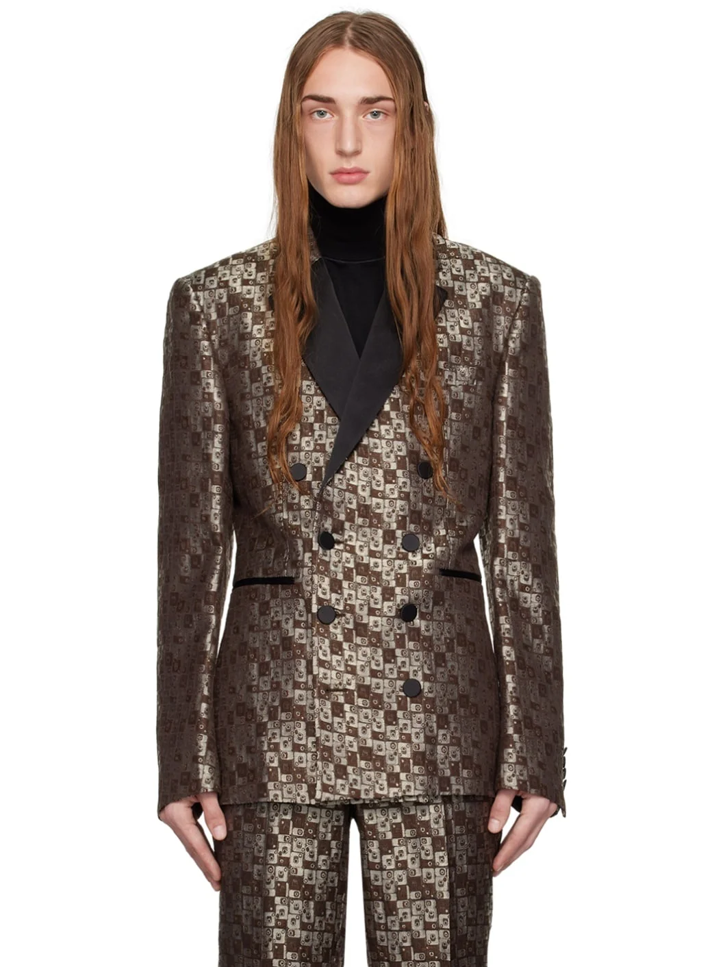 Viscose- and linen-blend gobelin blazer. Jacquard graphic pattern throughout. · Notched lapel · Double-breasted button closure · Welt pockets · Padded shoulders · Four-button surgeon's cuffs · Central vent at back hem · Welt pocket at interior · Full twill lining Supplier color: Brown Body: 59% viscose, 20% linen, 15% polyester, 6% silk. Lining: 100% cupro. Made in Morocco 241358M195000