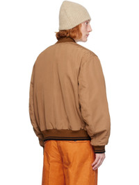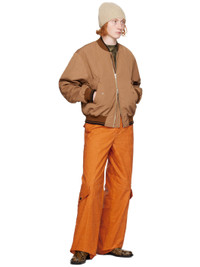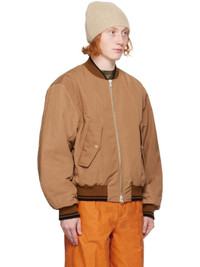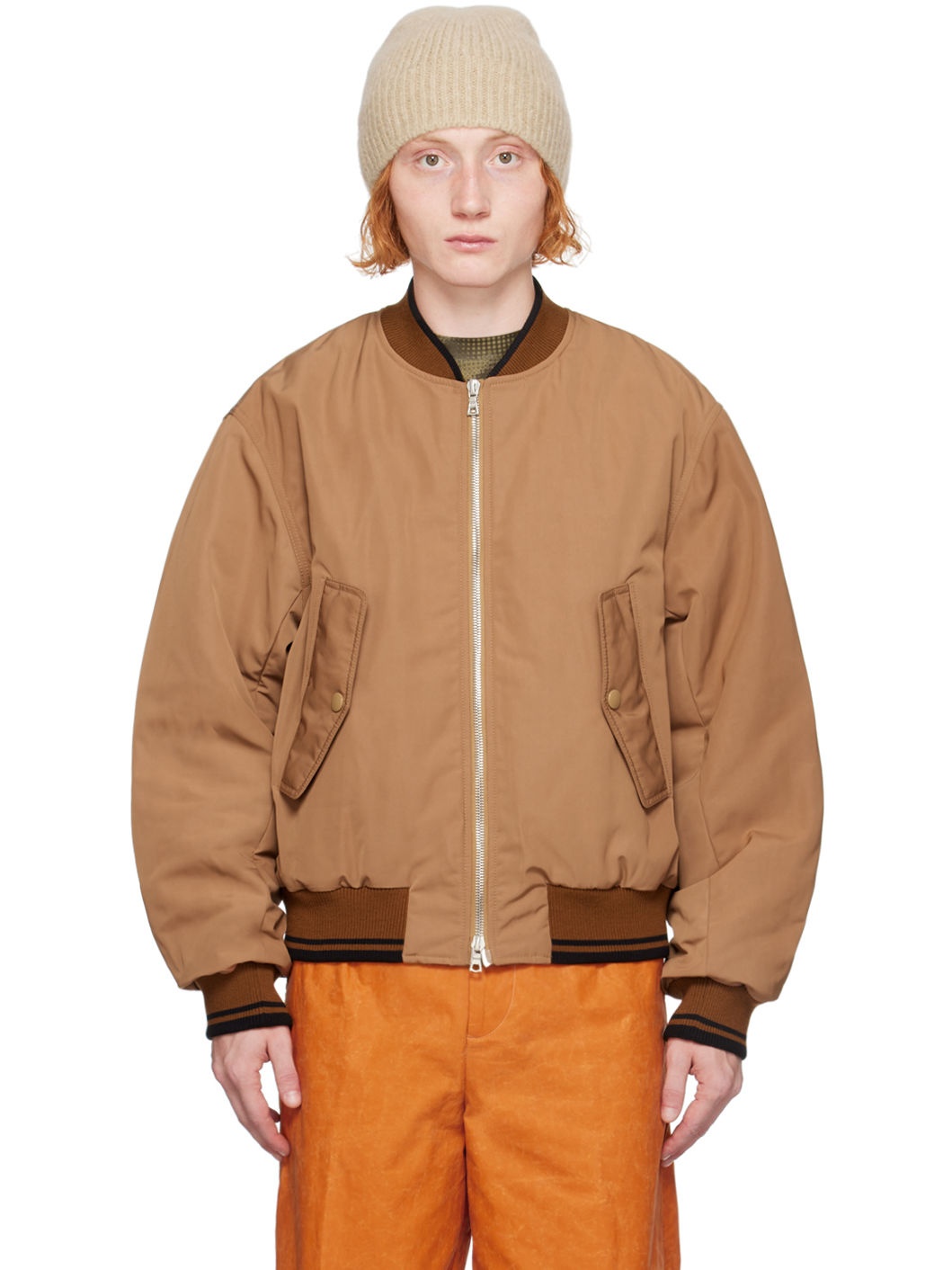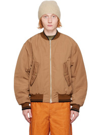 Insulated polyester taffeta bomber jacket. · Rib knit stand collar, hem, and cuffs · Two-way zip closure · Flap pockets · Dropped shoulders · Welt pocket at interior · Full quilted cotton, viscose- and polyester-blend twill lining Supplier color: Camel Body: 100% polyester. Lining: 35% cotton, 33% viscose, 31% polyester, 1% polyamide. Made in Hungary 242358M175006