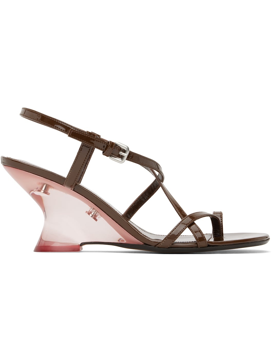 Patent leather heeled sandals in brown. · Open toe · Toe strap and crisscrossing straps at vamp · Pin-buckle ankle strap · Transparent plexiglass wedge heel · Polished leather sole · Heel: H2.75" Supplier color: Dark brown Upper: leather. Sole: rubber. Made in Italy 251358F125020