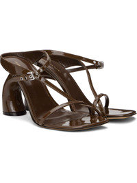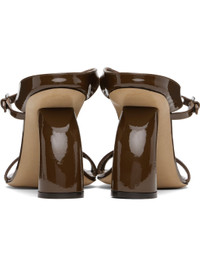 Patent calfskin heeled sandals in brown. · Open square toe · Crisscrossing straps at vamp · Pin-buckle ankle strap · Logo stamp at padded footbed · Modified comma heel with rubber injection · Leather sole · Heel: H3.5" Supplier color: Dark brown Upper: calfskin. Sole: leather, rubber. Made in Italy 251358F125019