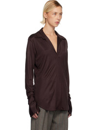 Viscose satin shirt. · Open spread collar · Plunging V-neck · Shirttail hem · Central vent at front hem · Buttoned barrel cuffs Supplier color: Burgundy 100% viscose. Made in Portugal 252358F109008