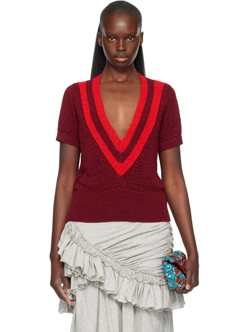 Semi-sheer open-knit sweater. · Stripes at plunging V-neck · Rib-knit hem and cuffs Supplier color: Bordeaux 60% viscose, 40% polyamide. Made in Belgium 261358F100001