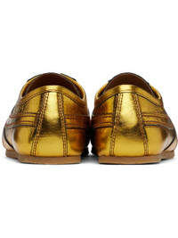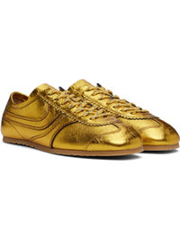 Low-top cracked leather sneakers in metallic gold tone. · Square toe · Serrated edge at vamp · Lace-up closure · Logo embossed at tongue · Stripe appliques at sides · Treaded rubber sole Supplier color: Gold Upper: leather. Sole: rubber. Made in Italy 251358F128004