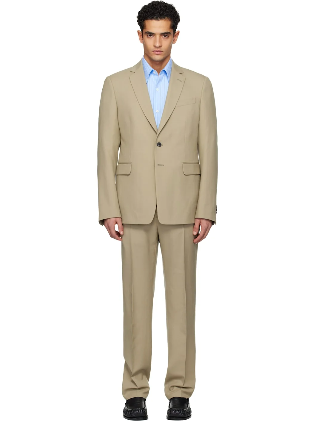 Wool-blend twill suit. · Notched lapel · Button closure · Flap pockets at front · Padded shoulders · Surgeon's cuffs · Vents at back hem · Welt pockets at interior · Full satin lining · Belt loops · Four-pocket styling · Zip fly · Creased legs · Knee-length satin lining Supplier color: Cement Body: 83% wool, 17% mohair. Lining: 100% cupro. Made in Morocco 261358M196003