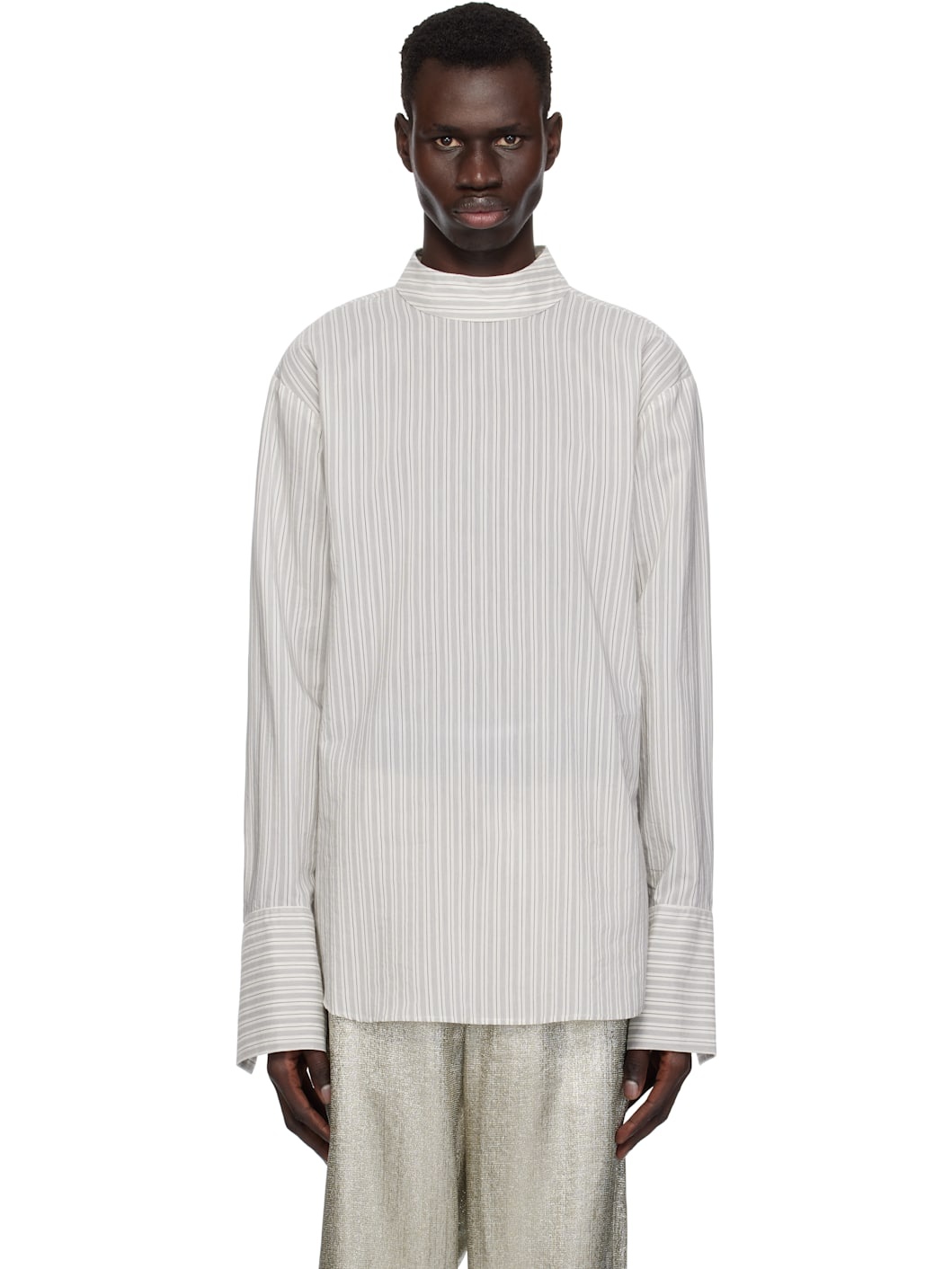 Cotton poplin shirt. Stripes throughout. · Turtleneck · Shirttail hem · Dropped shoulders · French cuffs · Spread collar and four-button placket at back Supplier color: Light grey 100% cotton. Made in Hungary 251358M192019
