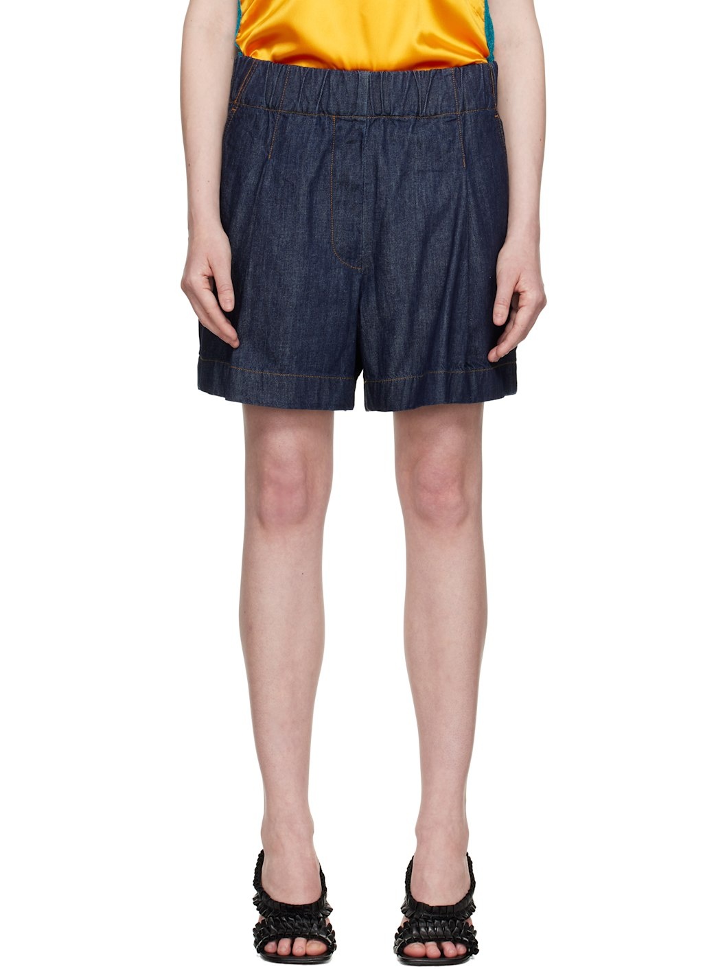 Lightweight loose-fit non-stretch denim shorts. · Mid-rise · Concealed drawstring at elasticized waistband · Three-pocket styling · Pleats at front · Contrast stitching in tan Supplier color: Indigo 100% cotton. Made in Tunisia 251358F088001