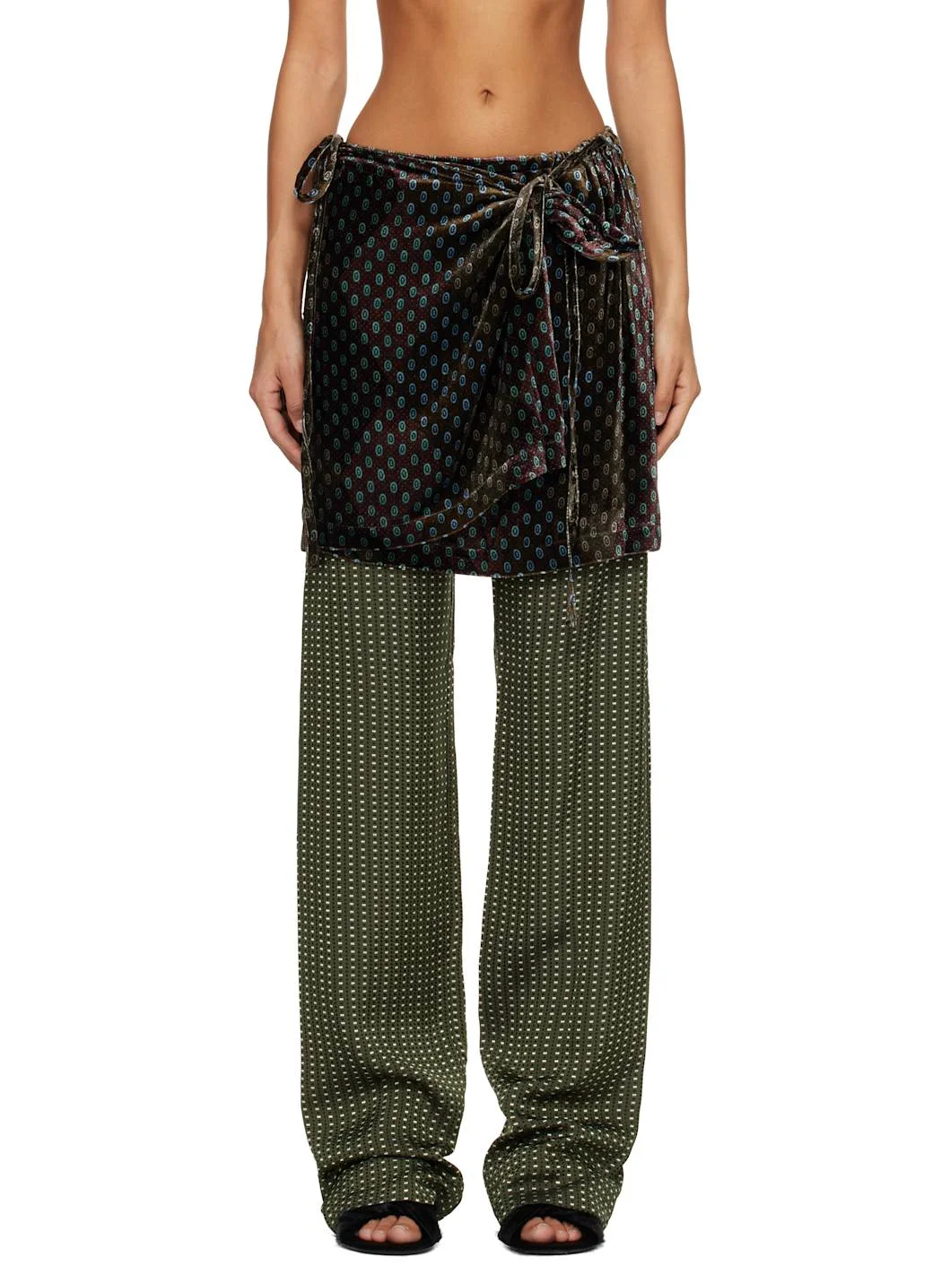 Viscose- and silk-blend dobby cloth trousers. · Wrap construction · Graphic pattern printed throughout · Velvet skirt-style overlay · Self-tie fastening at side seams Supplier color: Khaki 92% viscose, 8% silk. Made in Tunisia 252358F087018