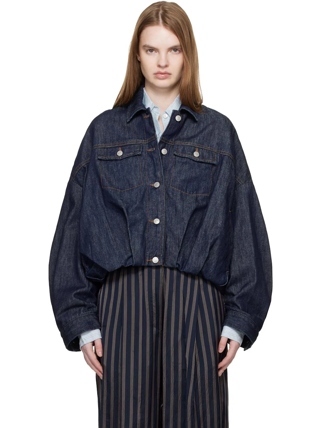 Non-stretch denim jacket. · Spread collar · Button closure · Button flap pockets at chest · Welt pockets at waist · Partially elasticized bubble hem · Dropped shoulders · Barrel cuffs · Patch pocket at interior · Partial twill lining · Contrast stitching in tan Supplier color: Indigo Body: 100% cotton. Lining: 100% cotton. Made in Tunisia 261358F060000