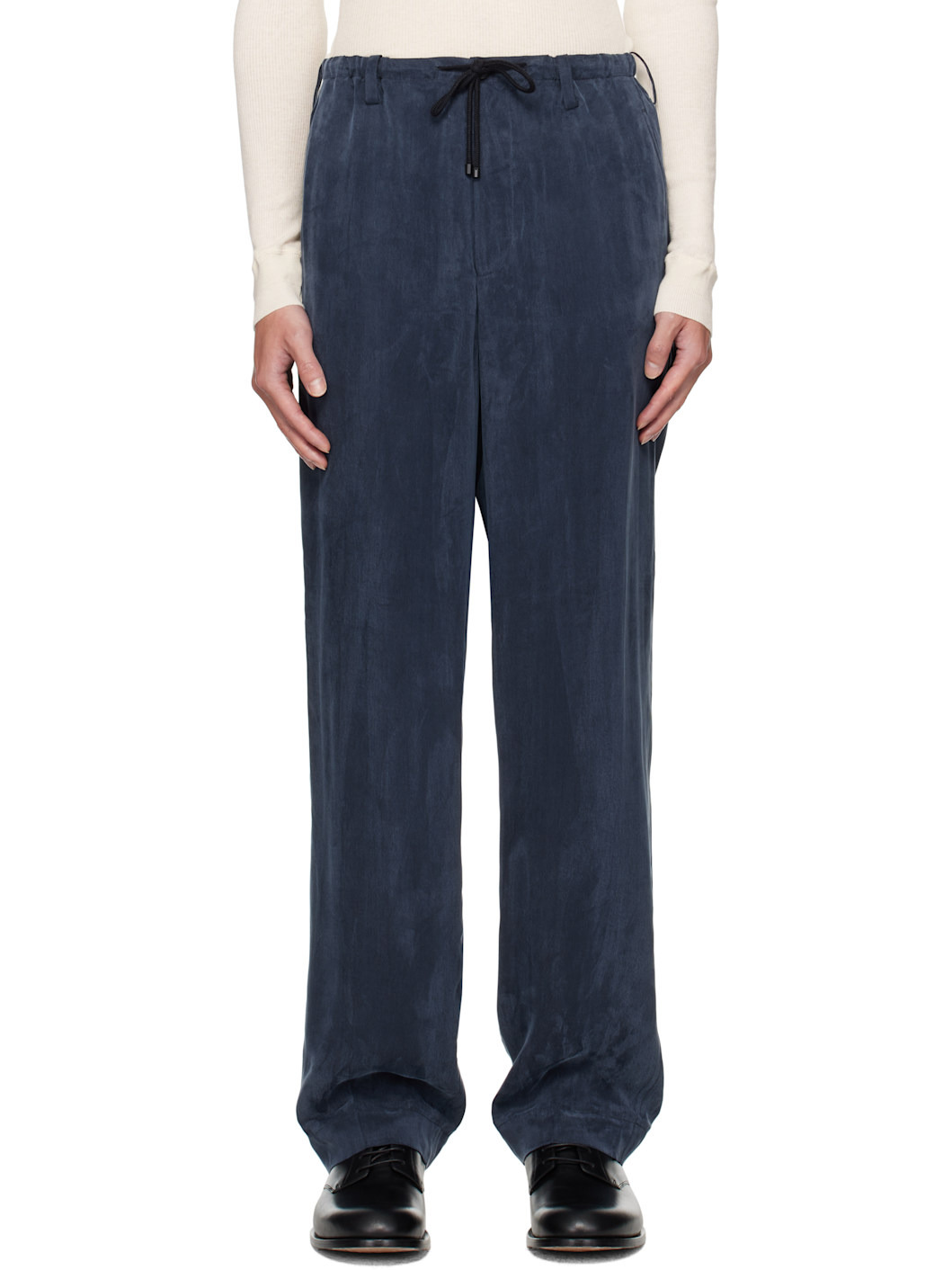 Peached cupro twill trousers. · Drawstring at elasticized waistband · Belt loops · Three-pocket styling · Creased legs Supplier color: Navy 100% cupro. Made in Tunisia 252358M191051