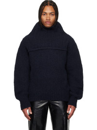 Oversized boucle-knit wool sweater. · Rib-knit turtleneck, hem, cuffs, and back · Pinched seam at chest · Dropped shoulders Supplier color: Navy 100% wool. Made in Belgium 252358M205000
