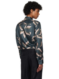 Silk satin shirt. Graphic pattern printed throughout. · Spread collar · Concealed button closure · Shirttail hem · Pleats at adjustable single-button barrel cuffs · Darts at back Supplier color: Dark navy 100% silk. Made in Hungary 251358M192053