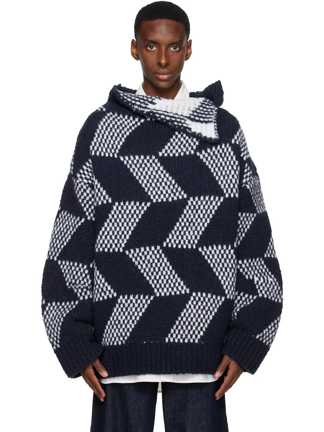 Knit wool- and alpaca-blend turtleneck. · Jacquard graphic pattern throughout · Notch at asymmetrical foldover collar · Rib-knit hem and cuffs · Dropped shoulders Supplier color: Navy 63% wool, 30% alpaca, 7% polyamide. Made in Belgium 252358M205005