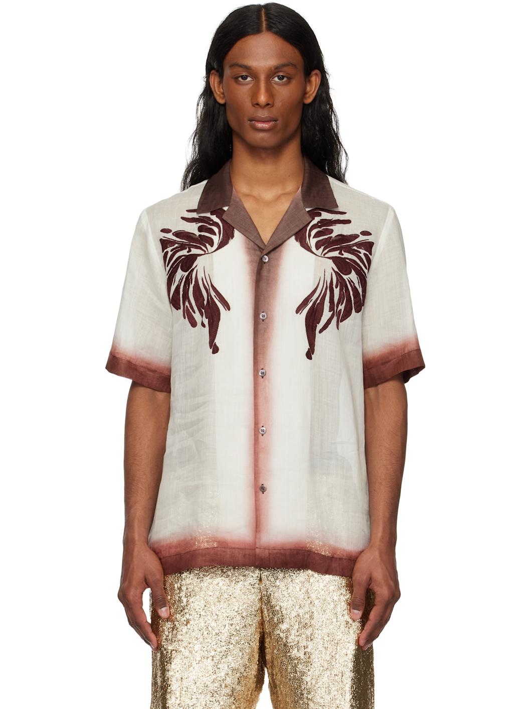 Semi-sheer ramie poplin shirt. · Open spread collar · Button closure · Graphics embroidered at chest · Pleats at back yoke Supplier color: Burgundy 100% ramie. Made in India 252358M192002
