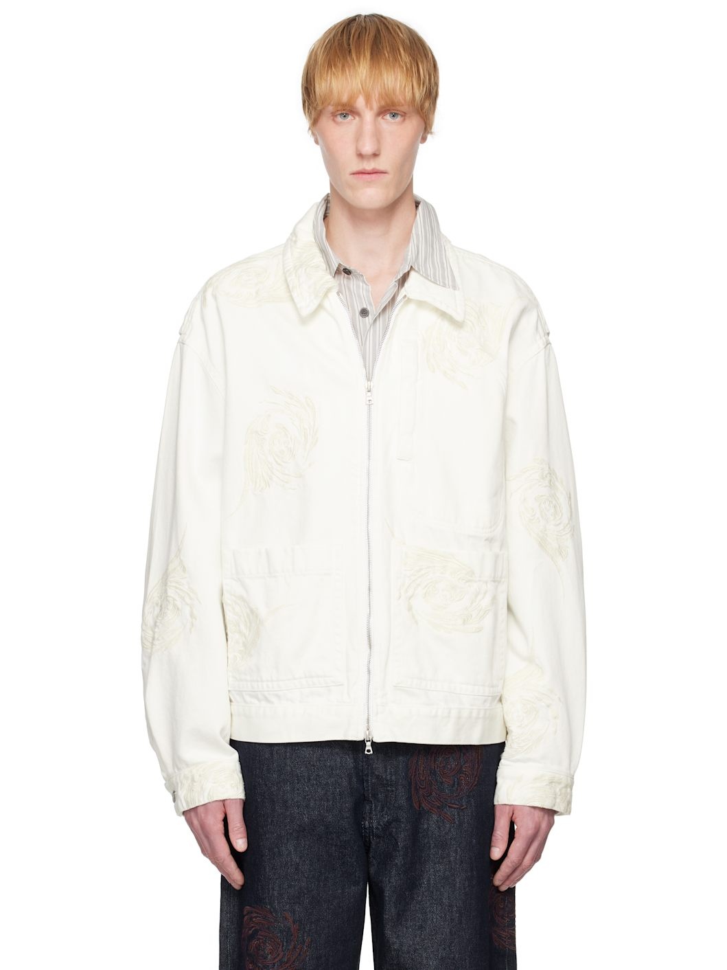 Non-stretch denim jacket. Embroidered graphic pattern throughout. · Spread collar · Two-way zip closure · Zip pocket at chest · Patch pockets · Dropped shoulders · Pleat at adjustable buttoned barrel cuffs · Pleats at back · Adjustable button tabs at back hem · Logo-engraved silver-tone hardware Supplier color: Off white 100% cotton. Made in Tunisia 252358M180000