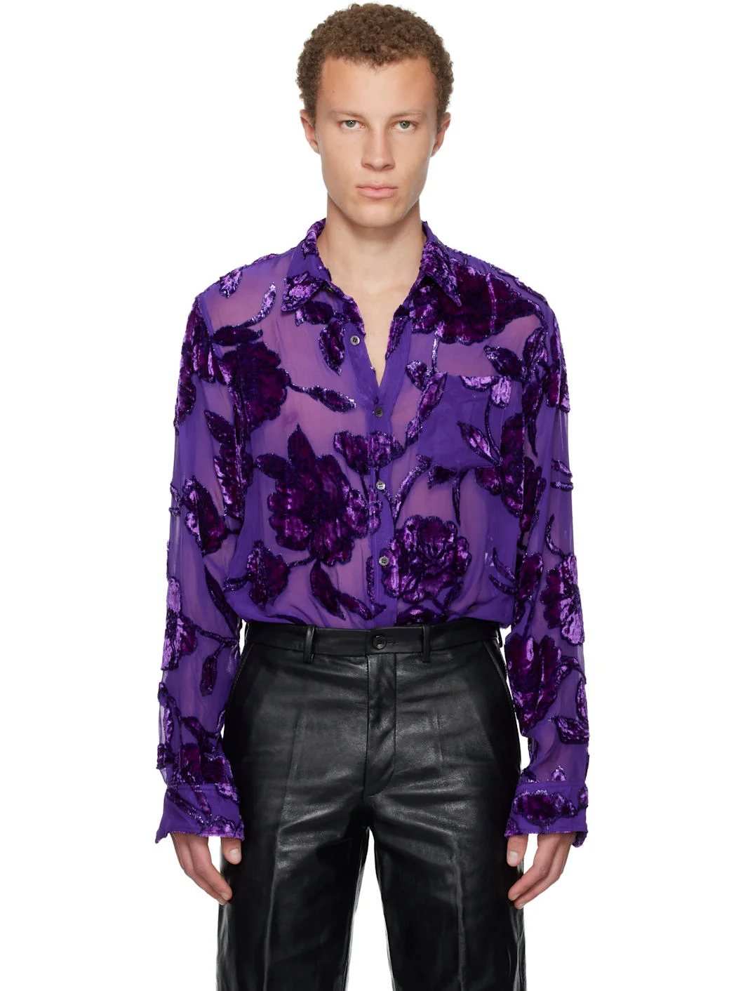 Semi-sheer viscose- and silk-blend chiffon shirt. Fil-coupe and metallic thread floral pattern throughout. · Slim-fit · Spread collar · Button closure · Patch pocket at chest · Shirttail hem · Buttoned barrel cuffs · Central seam at back Supplier color: Purple 61% viscose, 24% silk, 15% polyester. Made in Hungary 252358M192069
