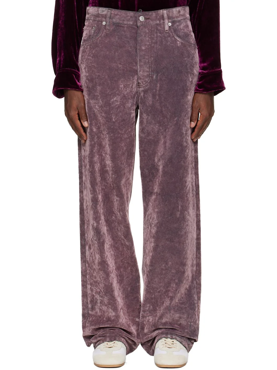 Flocked non-stretch denim jeans. · Straight-leg · Mid-rise · Belt loops · Five-pocket styling · Button fly · Leather logo patch at back waistband · Logo-engraved silver-tone hardware Supplier color: Lilac 100% cotton. Made in Italy 252358M186010