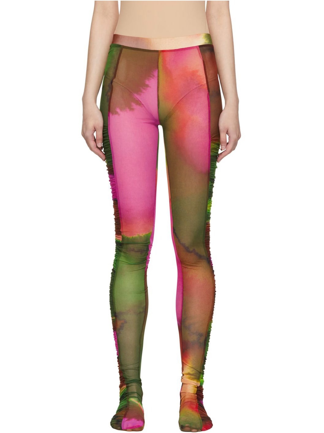 Sheer stretch nylon mesh leggings featuring graphic pattern printed in multicolor throughout. Ruffled detailing at outseam. Supplier color: Fuchsia 93% polyamide, 7% elastane.
