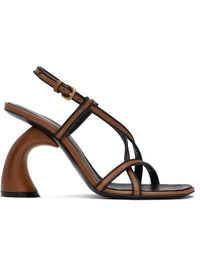 Buffed leather heeled sandals in tan and black. · Piping throughout · Open square toe · Crisscrossing straps at vamp · Pin-buckle slingback strap · Logo stamp at padded footbed · Covered sculptural heel with rubber injection · Polished leather sole · Heel: H3.5" Supplier color: Tan Upper: leather. Sole: leather, rubber. Made in Italy 251358F125000