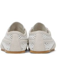 Low-top nappa calfskin suede and mesh sneakers in white and beige. · Lace-up closure · Serrated edge at vamp · Logo embossed at tongue · Stripe appliques at sides · Treaded rubber sole Supplier color: White Upper: calfskin, textile. Sole: rubber. Made in Italy 251358M237001