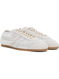 Low-top mesh and calfskin suede sneakers in white and taupe. · Serrated edge at vamp · Lace-up closure · Logo embossed at tongue · Stripe appliques at sides · Treaded rubber sole Supplier color: White Upper: textile, calfskin. Sole: rubber. Made in Italy 251358F128002