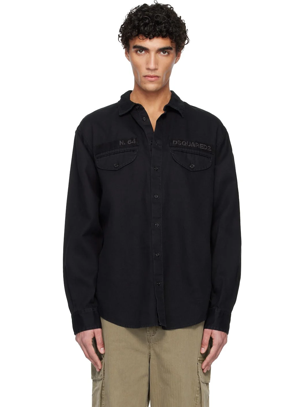 Non-stretch denim shirt. · Spread collar · Button closure · Flap pockets and embroidered logo patches at chest · Shirttail hem · Barrel cuffs · Inverted box pleat at back yoke Supplier color: Black 100% cotton. Made in Italy 252148M192010