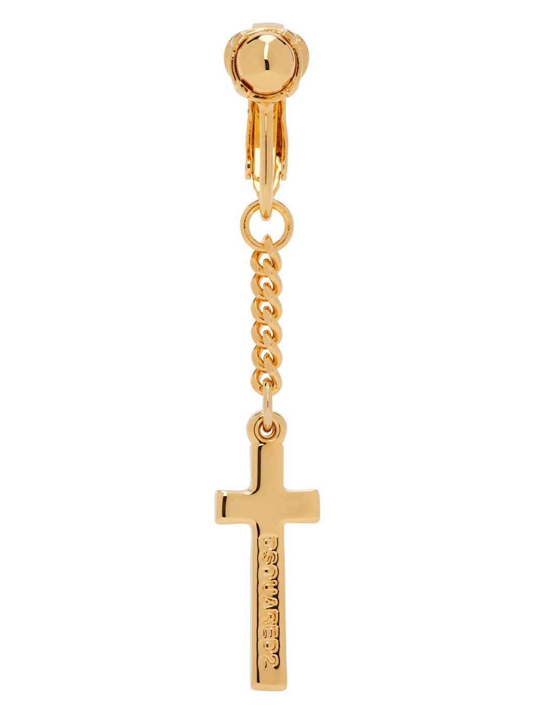 Single drop earring in gold tone. · Logo-engraved graphic charm at drop · Clip-on fastening · H2" x W0.5" Supplier color: Gold Tin alloy, brass. Made in Italy 242148M144003