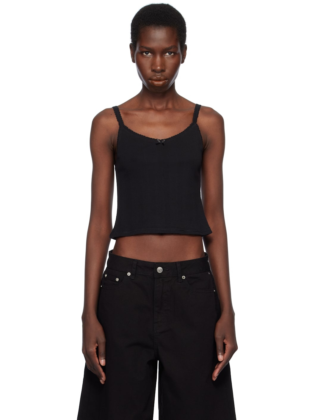 Pointelle-knit cotton camisole. · Picot trim at scoop neck · Bow accent at chest · Cropped hem · Fixed spaghetti straps Supplier color: Black 100% cotton. Made in South Korea 251965F111001