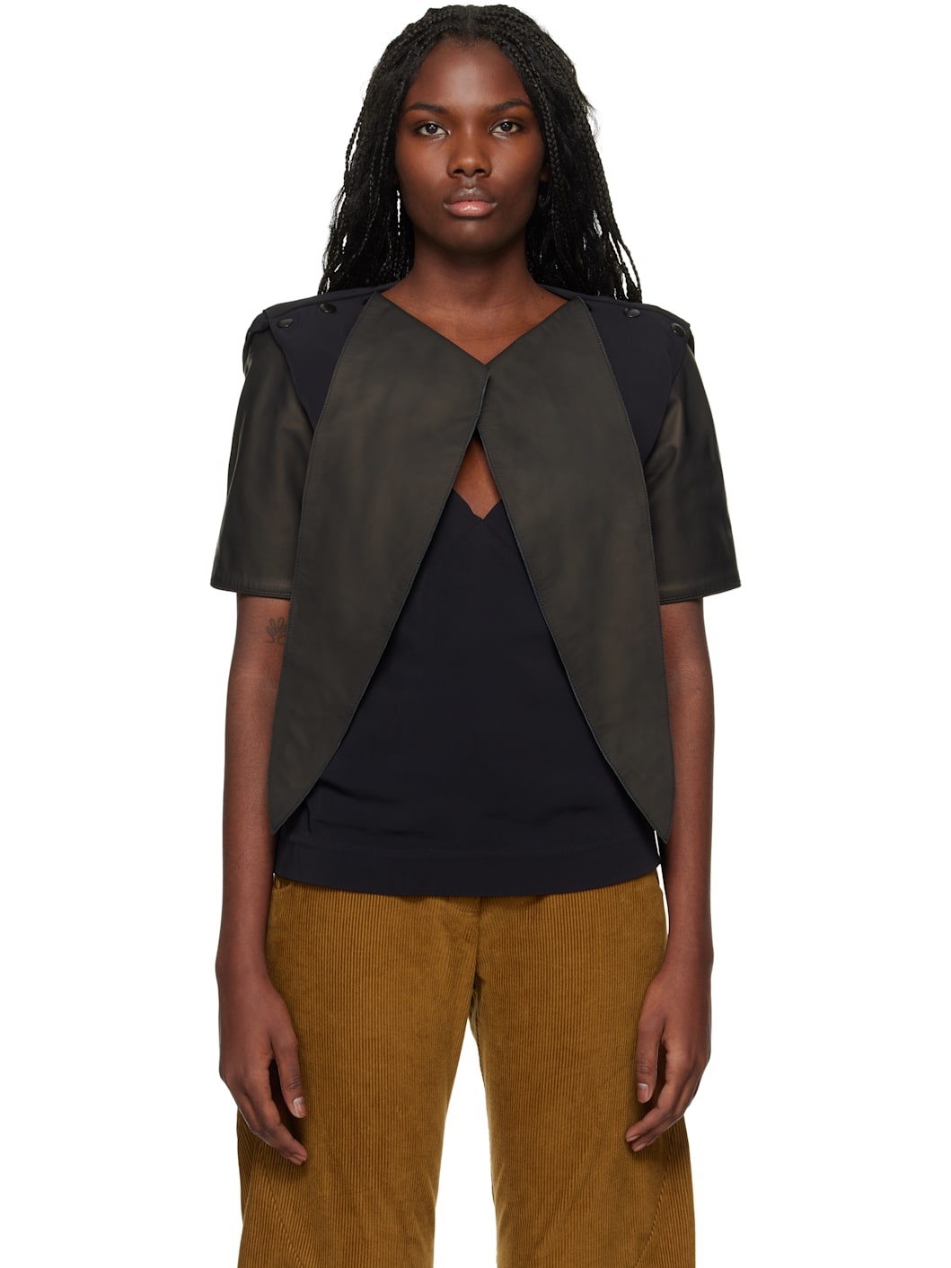 Viscose bonded jersey and grained leather T-shirt. · Paneled and layered construction · V-neck · Press-stud fastenings at shoulders · Cutout and draping at back Part of the ECCO.Kollektive x Kiko Kostadinov collaboration. Supplier color: Black Body 1: 100% viscose. Body 2: 100% leather. Lining: 100% cotton. Made in India 242953F110000
