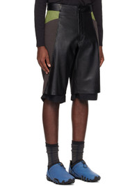 Buffed leather and cotton twill shorts. · Paneled construction · Belt loops · Stripe-embossed nubuck trim at waist · Four-pocket styling · Zip-fly · Studs at front · Inset seersucker cuffs · Full cotton seersucker lining Part of the ECCO.kollektive x Kiko Kostadinov collaboration. Supplier color: Black/Turtle green Body 1: 100% leather. Body 2: 100% cotton. Lining: 100% cotton. Made in Turkey 241953M193001