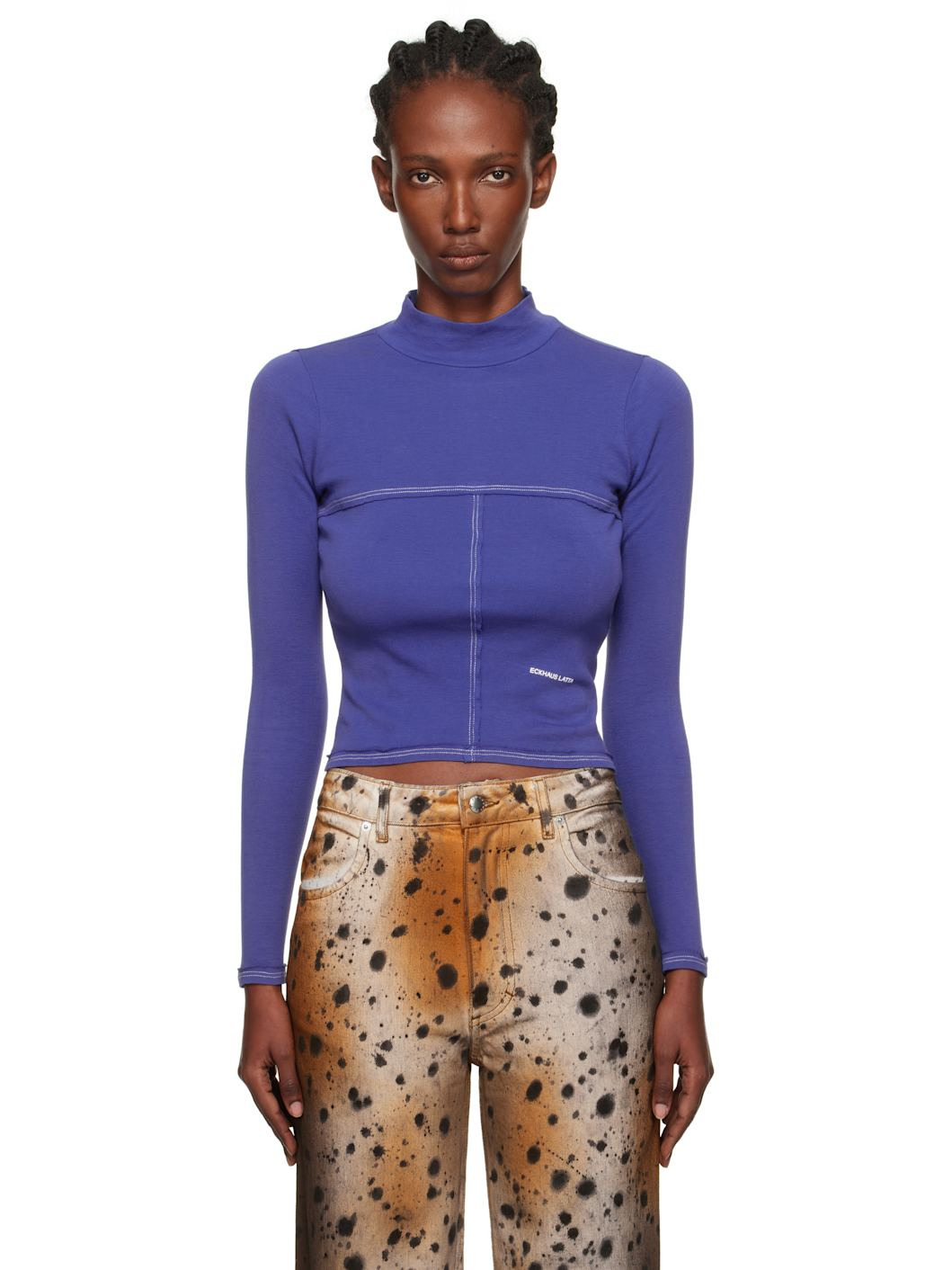 Rib-knit cotton turtleneck. · Raw edges throughout · Paneled construction · Logo printed at front · Cropped hem · Contrast stitching in white Supplier color: Ultramarine 100% cotton. Made in Peru 252830F099002