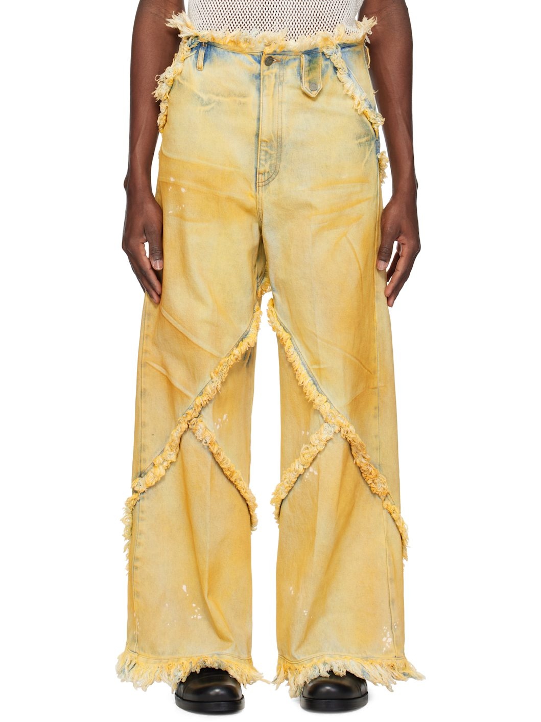 Non-stretch denim jeans. Fading, smudging, paint splatter, and frayed edges throughout. · Paneled construction · Belt loops · Press-stud tab with logo hardware at waistband · Four-pocket styling · Zip fly · Logo-engraved gunmetal-tone hardware · Contrast stitching in tan Supplier color: Yellow dirty denim 100% cotton. Made in Tunisia 251830M186015