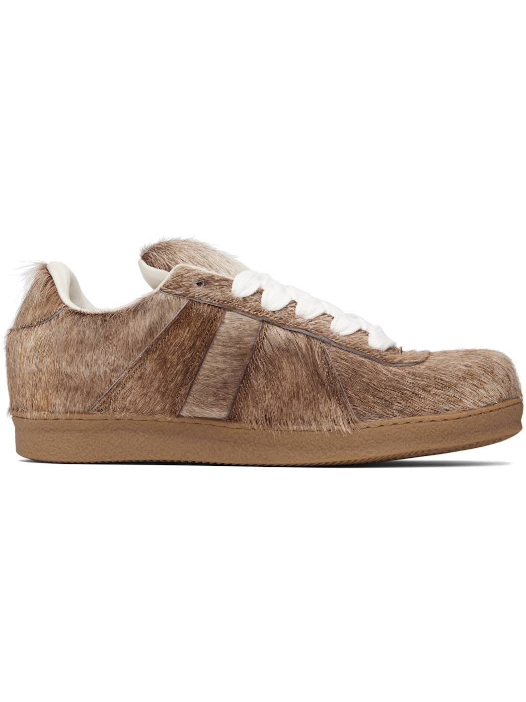 Low-top hair-on leather sneakers. · Lace-up closure · Padded tongue and collar · Buffed leather lining · Treaded rubber sole Supplier color: Beige Upper: leather. Sole: rubber. Made in Portugal 252830M237002