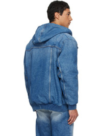 Non-stretch denim jacket. · Fading throughout · Drawstring at hood · Zip closure · Flap and patch pockets at front · Rib-knit hem and cuffs · Dropped shoulders · Zip pocket at interior · Full satin lining · Contrast stitching in tan Supplier color: Blue Body: 100% cotton. Trim: 100% cotton. Lining: 100% viscose. Made in Tunisia 252830M180008