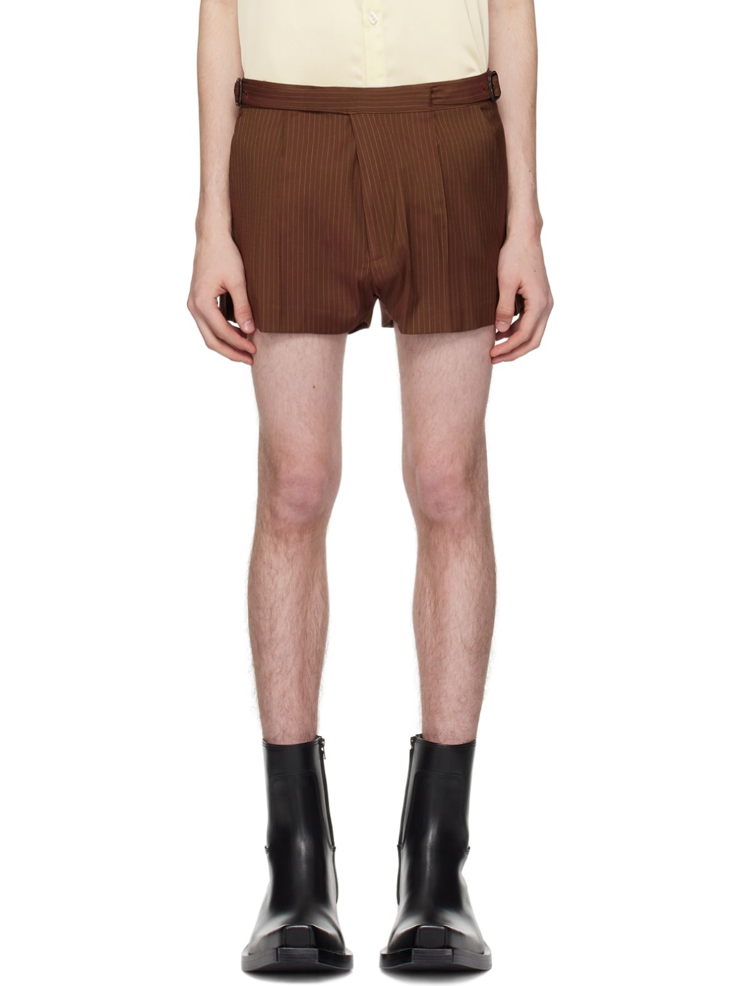 Plain-woven stretch virgin wool- and viscose-blend shorts. Pinstripes throughout. · Belt loops · Adjustable pin-buckle tabs at waistband · Four-pocket styling · Zip-fly · Pleats at front Supplier color: Brown stripes 54% virgin wool, 42% viscose, 4% elastane. Made in Hungary 241830M193003