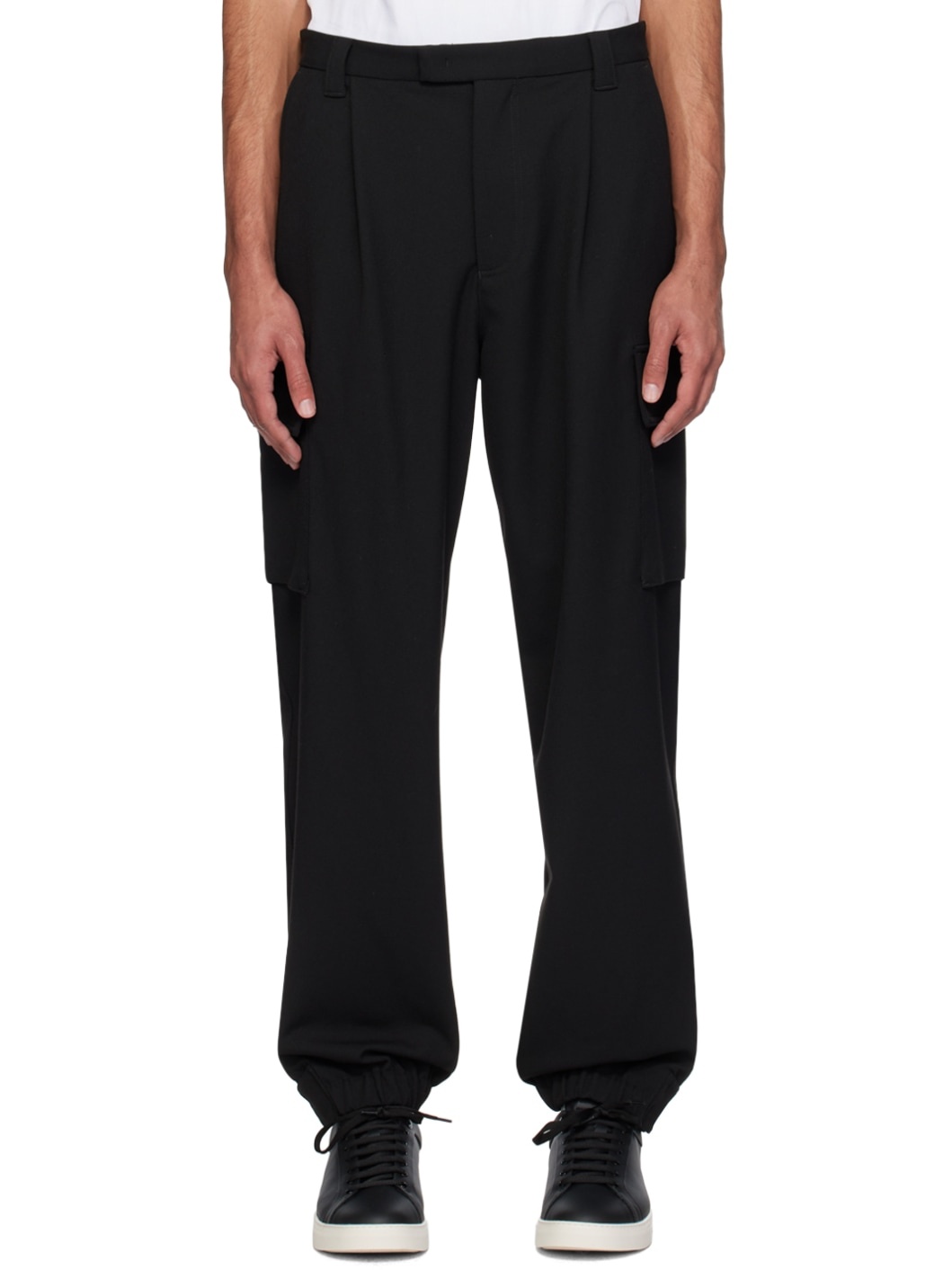 Stretch polyester-blend twill cargo pants. · Belt loops · Three-pocket styling · Zip-fly · Pleats at front · Adjustable button tabs at elasticized cuffs · Cargo pocket at outseams Supplier color: Black 68% polyester, 29% viscose, 3% elastane. Made in Tunisia 241951M188000