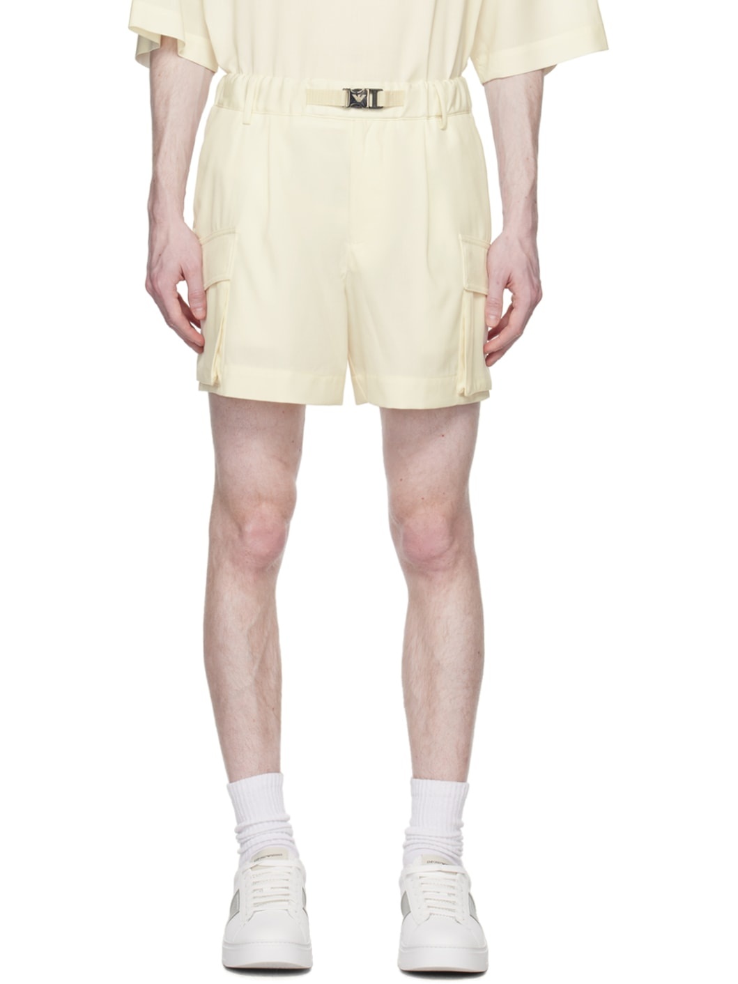 Wool gabardine shorts. · Elasticized waistband · Integrated grosgrain belt with press-release fastening · Four-pocket styling · Zip-fly · Pleats at front · Cargo pockets at outseams · Logo embroidered at back Supplier color: Bianco panna 100% virgin wool. Made in Tunisia 231951M191012