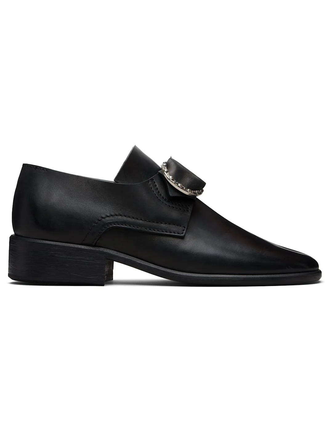 Buffed leather loafers. · Square toe · Pin-buckle fastening at vamp · Stacked leather block heel and sole · Heel: H1.5" Supplier color: Black Leather. Made in Italy 252889M231003
