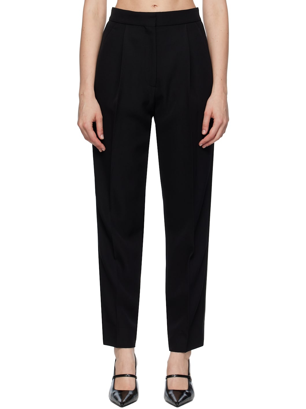 Wool grain de poudre trousers. · Four-pocket styling · Zip-fly · Pleats at front · Creased legs · Silk-blend satin trim at outseams Supplier color: Black Body: 100% wool. Lining: 65% polyester, 35% cotton. Trim 1: 78% silk, 22% polyester. Trim 2: 50% cotton, 50% polyester. Made in United Kingdom 252641F087000